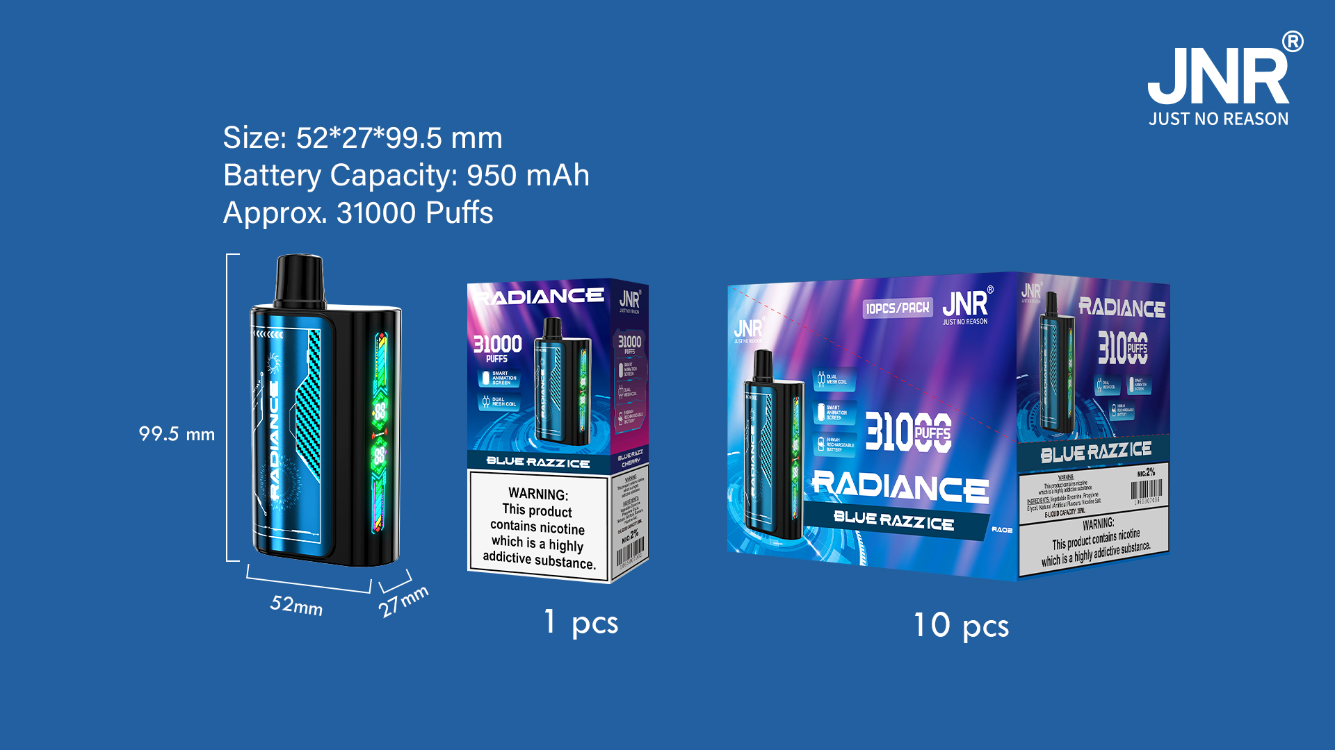 Pre-filled with a massive 28ml of e-liquid and powered by a long-lasting 950mAh rechargeable battery, the JNR Radiance offers up to 31,000 puffs—perfect for all-day, on-the-go use. The advanced 1.2Ω dual mesh coil ensures smooth, flavorful clouds, while Type-C fast charging means you’re never left waiting. From its tech-driven interface to its reliable power and rich vapor output, the JNR Radiance delivers a premium, user-friendly vaping experience that stands out from the crowd.