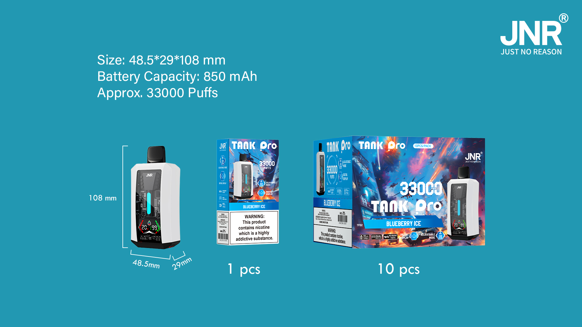 The built-in digital display provides clear insights into power levels and puff tracking, while its ergonomic design ensures easy handling. With three nicotine strengths to choose from — 0%, 2%, and 5% — the JNR Tank Pro 33000 suits a variety of preferences, whether you're nicotine-free or craving that full hit.